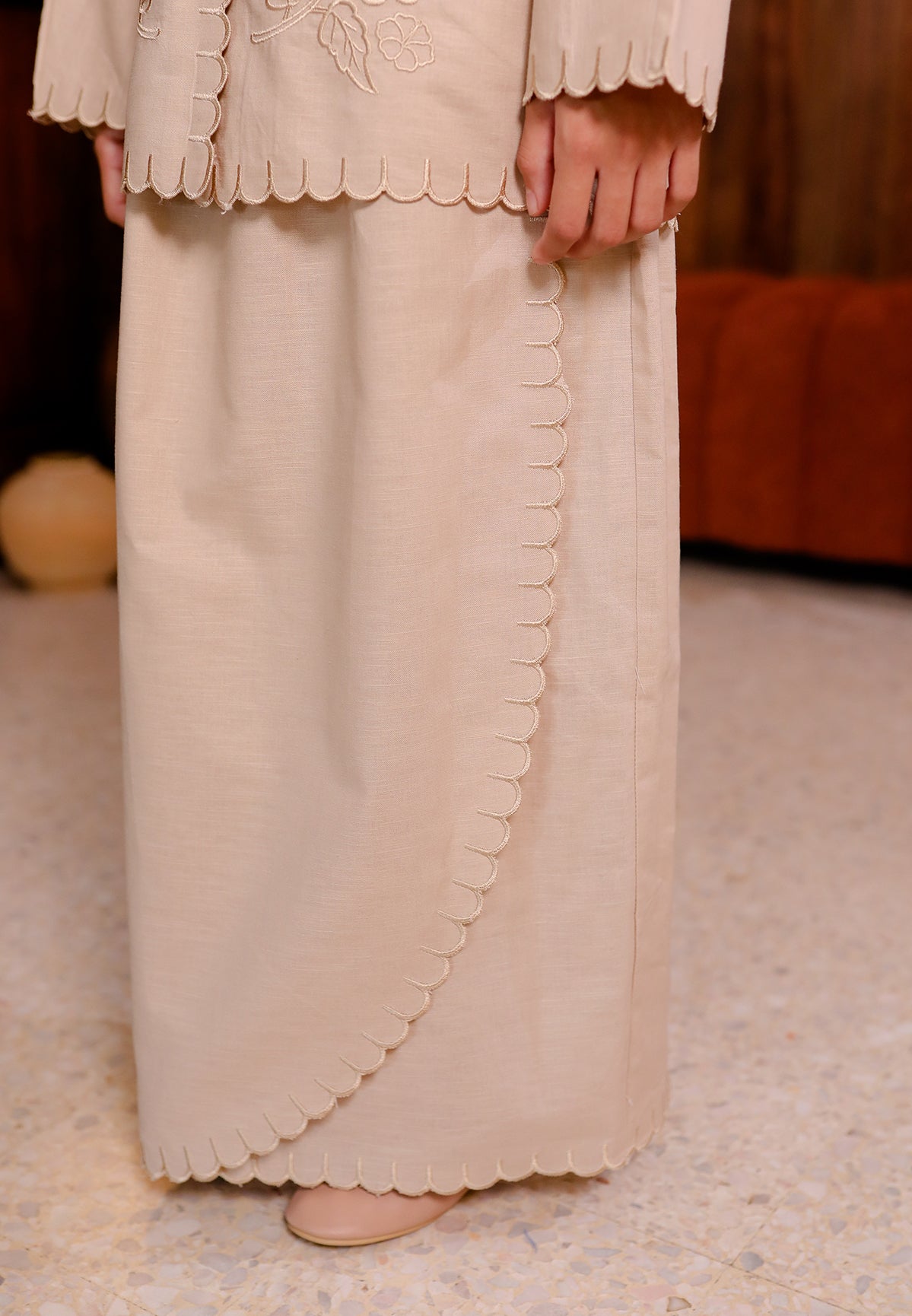 - A pleated skirt with soft folds at the front (lipat batik), creating a flowy and elegant look